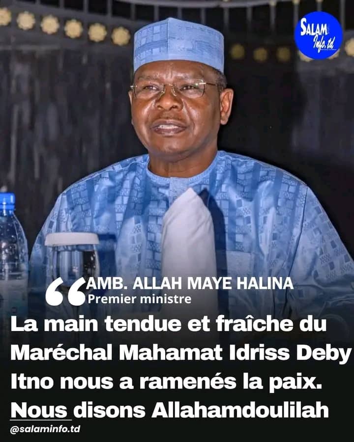 Lors de la cérémonie de réjouissance relative à la promulgation de la nouvelle Constitution, le Premier ministre Allamaye Halina a déclaré, sans trembler : « La main tendue et fraîche du Maréchal Mahamat Idriss Déby Itno nous a ramené la paix. Nous disons Allahamdoulilah. »