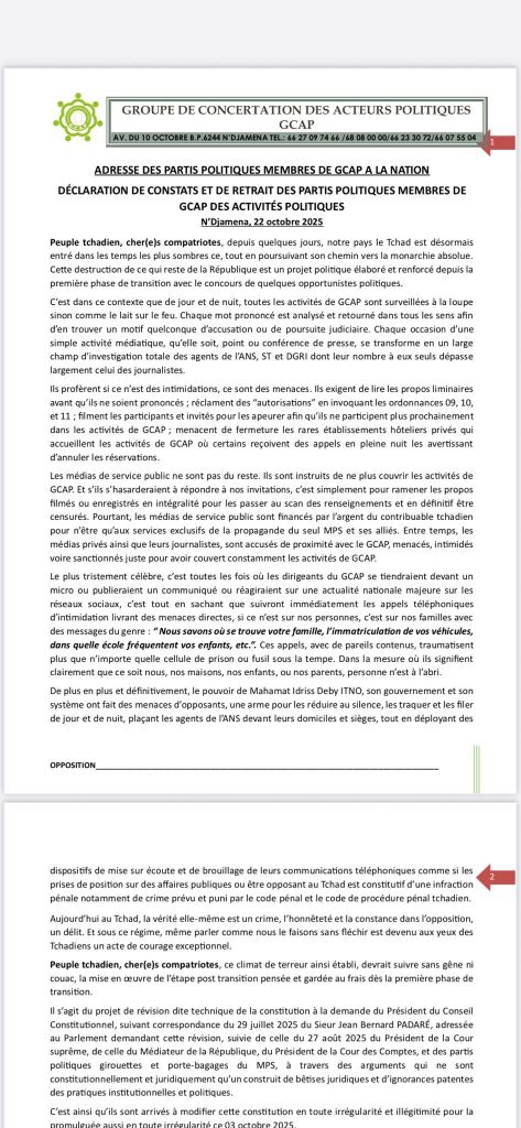 La déclaration des partis membres du Groupe de Concertation des Acteurs Politiques (GCAP) est un document politique acerbe qui dresse un tableau alarmant de l’état des libertés et de la démocratie au Tchad. En annonçant leur retrait politique effectif au 31 octobre 2025, les partis de l’opposition reconnaissent, implicitement et explicitement, l’échec de leurs actions face à une stratégie de terreur et de musellement orchestrée par le pouvoir.