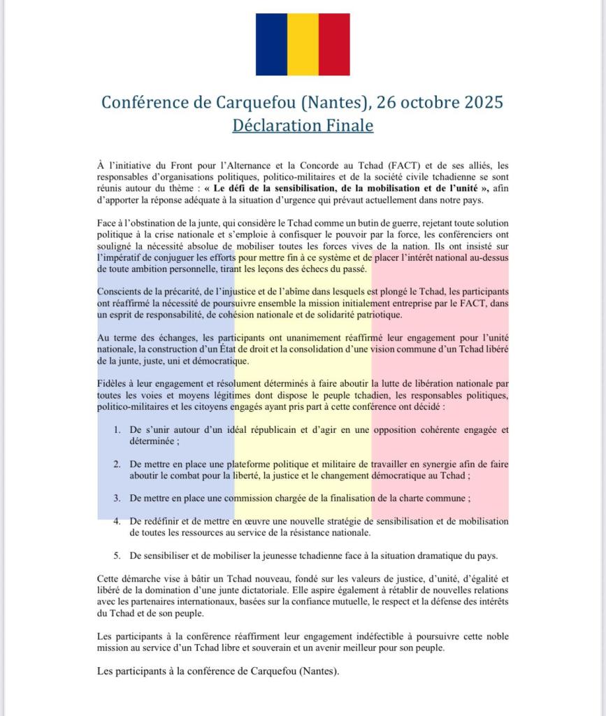 Une conférence tenue à Carquefou, près de Nantes (France), le 26 octobre 2025, a réuni le Front pour l’Alternance et la Concorde au Tchad (FACT) et ses alliés, ainsi que des responsables d’organisations politiques, politico-militaires et de la société civile tchadienne. La déclaration finale de cette rencontre, axée sur le thème « Le défi de la sensibilisation, de la mobilisation et de l’unité », marque un durcissement du ton de l’opposition et un appel sans équivoque à l’action concertée pour le retour à l’ordre constitutionnel.