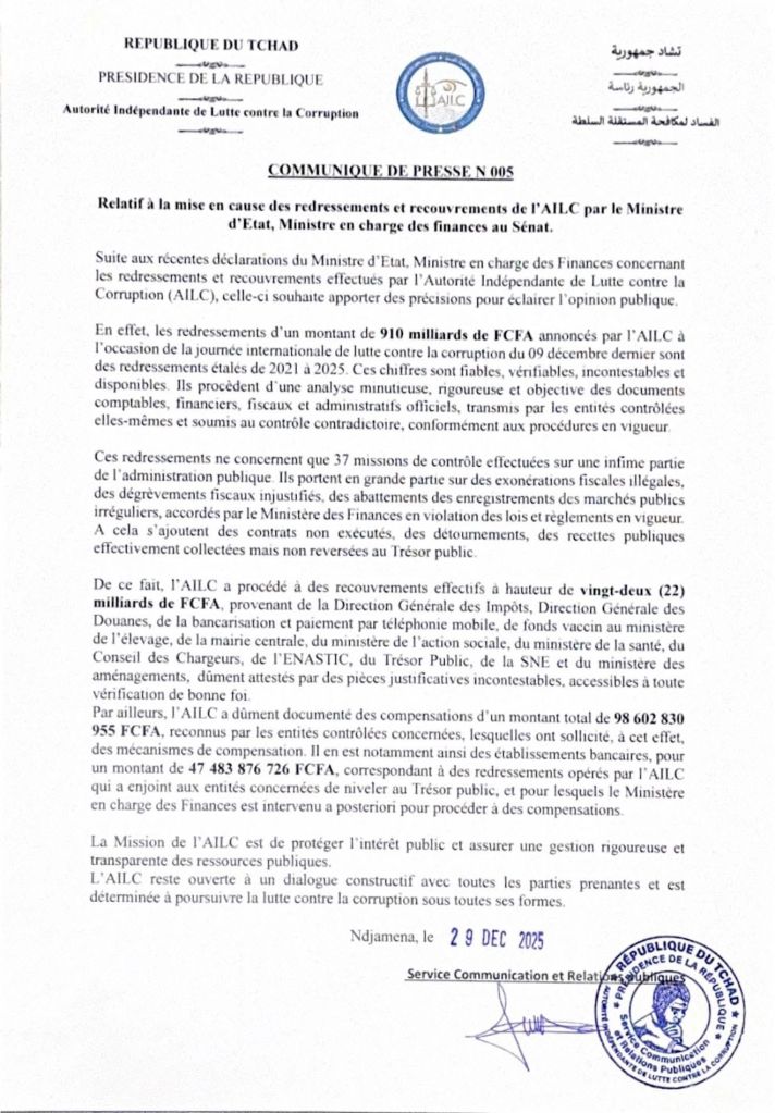 Le communiqué de presse de l’Autorité Indépendante de Lutte contre la Corruption (AILC), publié le 29 décembre 2025, marque un tournant dans les rapports entre institutions de contrôle et pouvoir exécutif au Tchad. En réponse aux déclarations du ministre d’État en charge des Finances, Tahir Hamit Nguilin, l’AILC défend avec fermeté la légitimité de ses redressements, estimés à 910 milliards FCFA sur la période 2021–2025.