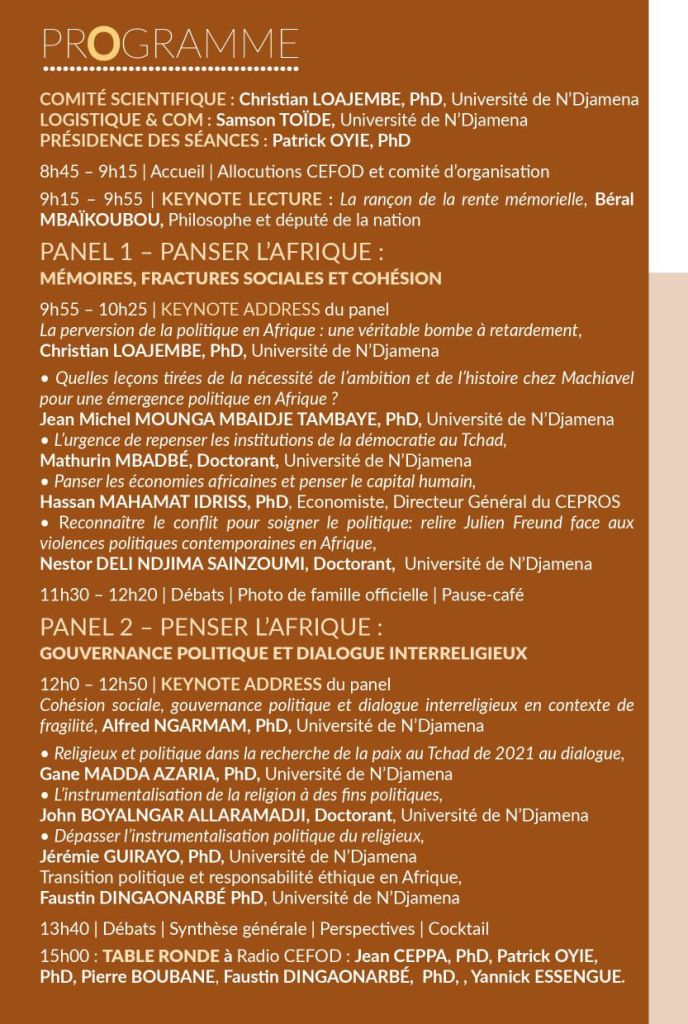 Ainsi, la conférence inaugurale du philosophe et député Béral Mbaïkoubou, autour de “la rançon de la rente mémorielle”, s’inscrit dans cette exigence critique:comment éviter que le passé, instrumentalisé ou sacralisé, ne devienne un obstacle à l’invention du politique ? Penser la gouvernance, c’est assumer la mémoire sans en faire une prison, et inscrire l’action publique dans une éthique de responsabilité tournée vers l’avenir.