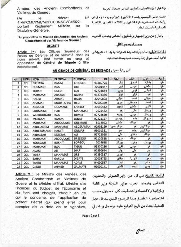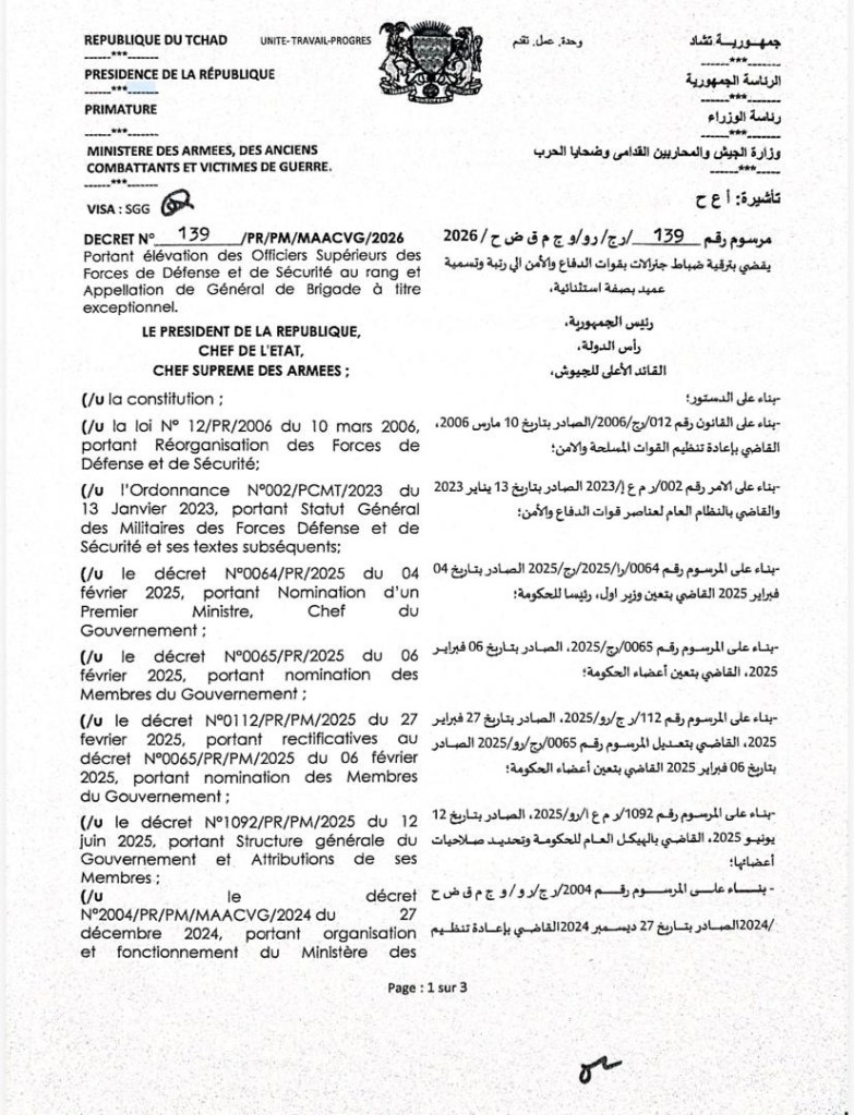Par décret N°139/PR/PM/MAACVG/2026, vingt-deux officiers supérieurs des Forces de défense et de sécurité ont été élevés, à titre exceptionnel, au rang et à l’appellation de Général de brigade. Une décision qui, à première vue, s’inscrit dans la logique de valorisation de l’armée tchadienne. Mais à y regarder de plus près, la composition de cette promotion soulève des interrogations majeures sur l’équilibre territorial, la cohésion nationale et la gouvernance du secteur sécuritaire. Dans un pays confronté à des défis sécuritaires persistants, la symbolique et l’équité dans la gestion de l’institution militaire deviennent des enjeux stratégiques.
